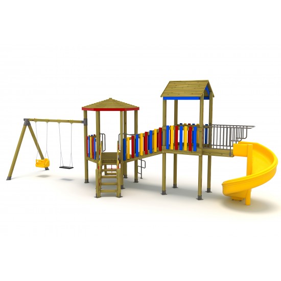 Ahşap, polietilen, hdpe, ip halat ve metal malzemelerden oluşur. Metal aksamlar açık hava koşullarına dayanıklı olacak şekilde kumlama yapılarak, galvaniz, polizing astar veya kataforez kaplanarak üzerine elektrostatik toz boya uygulanır. Polietilen parçalar renkli elektriklenmeyi önleyecek anti-statik özellikli ve sağlığa zararsız malzemeden üretilmiştir. Ahşap parçalarda, emprenyelenmiş 1. Sınıf malzeme kullanılır .